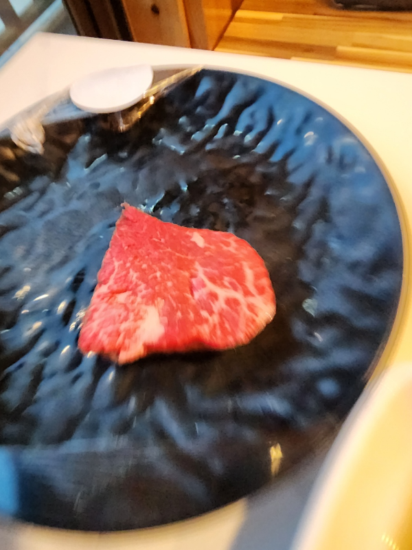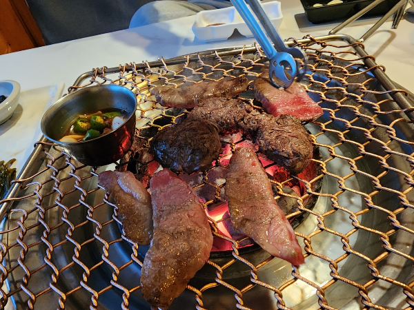 아이가 좋아하는 안심을 반 잘라 석쇠에 올려줍니다. 방갈로 안에서도 전기가 아닌 숯불이라서 환풍기는 꼭 틀어놓아야 합니다. 소음이 좀 거슬리긴 하지만 대화하는 데는 큰 불편함은 없습니다.